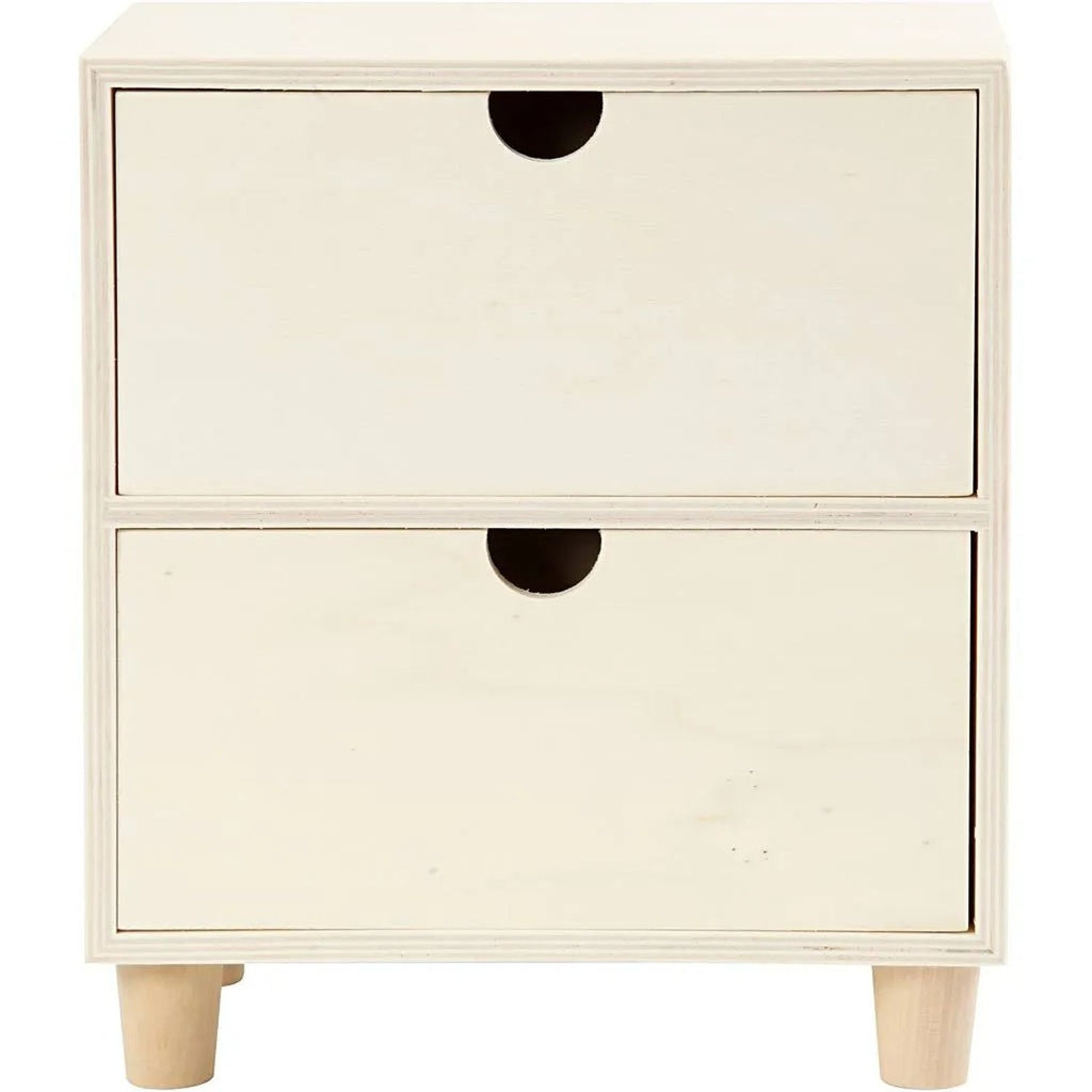 Small wooden chest with two drawers which is plain, unpainted, unfinished wood and ready-to-decorate. Paint, embellish, stain or cover with special papers or rice paper.